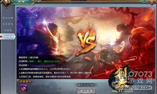 活動(dòng)每周一、周三、周五19:30-20:90開啟,活動(dòng)需提前報(bào)名,報(bào)名后可傳送進(jìn)入地圖,準(zhǔn)備階段可自由PK,但不計(jì)算成績,報(bào)名結(jié)束后活動(dòng)正式開啟,將玩家分為兩方陣營:合縱方和連橫方,正式比賽共分三輪,每一輪玩家都擁有5條生命值,全部用完后將無法復(fù)活,一方全部死亡或時(shí)間結(jié)束后生命數(shù)少的一方判定失敗,勝利方全員進(jìn)入下一輪,無論是否有剩余生命,勝利方全員進(jìn)入下一輪,并再次分為兩個(gè)陣營,同時(shí)將所有玩家生命數(shù)補(bǔ)足5條。