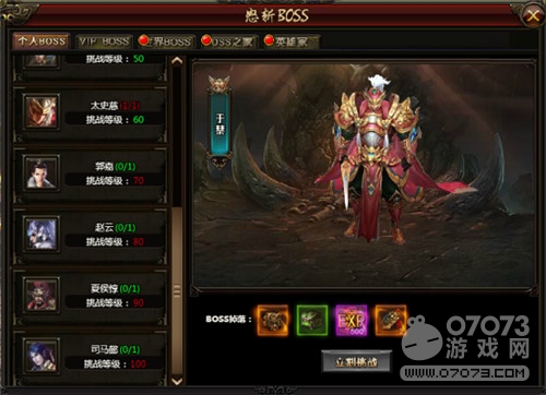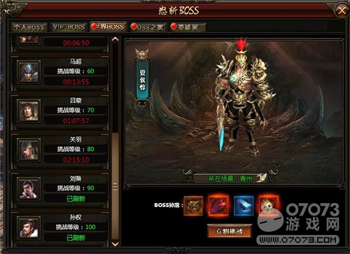 在1k2k《霸將三國》中,達(dá)到相應(yīng)的等級就可以挑戰(zhàn)個人BOSS啦!像于禁、黃忠、呂蒙、張遼等個人BOSS還是很容易擊殺的,如果你是VIP玩家,那么你就可以每天挑戰(zhàn)一次VIPBOSS,VIPBOSS目前只有張飛、關(guān)羽、孫權(quán)、劉備、曹操。