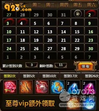 923yx《烈火戰(zhàn)神》中的簽到獎(jiǎng)勵(lì),是只要大家累計(jì)簽到次數(shù)達(dá)到2、5、10、17、26時(shí)便可領(lǐng)取獎(jiǎng)勵(lì)。簽到次數(shù)是以一個(gè)月為周期的,當(dāng)月累計(jì)的簽到次數(shù)會(huì)在下個(gè)月時(shí)清零,將重新計(jì)算簽到次數(shù)。若玩家當(dāng)月有未簽到次數(shù),也可進(jìn)行補(bǔ)簽。