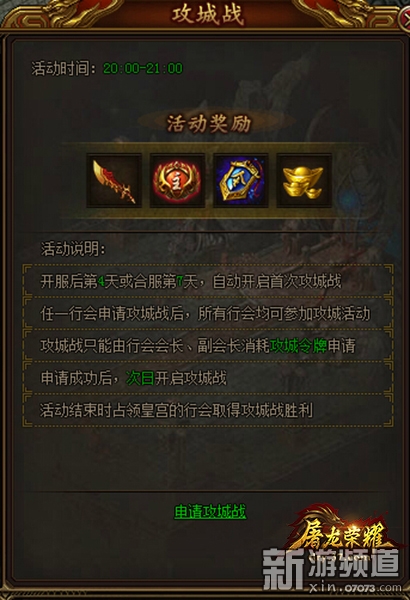 從開始到現(xiàn)在,從不曾停下腳步,追求強大力量的神獸,那劃破黑夜的一刀烈火,在暴風雪中咆哮的飄逸身影,都是留下輝煌的傳奇。此刻他們發(fā)出誠摯的呼喊,邀請你前來譜寫新的瑪法榮耀。游戲中,由行會會長或副會長,通過消耗攻城令牌申請攻城,次日20:00-21:00將開啟攻城戰(zhàn)。屆時所有行會成員均可參加攻城戰(zhàn)。在攻城戰(zhàn)中搶先占領(lǐng)皇宮,并在活動時間結(jié)束時將其占領(lǐng)(皇宮地圖所在玩家人數(shù),多的一方行會)即獲得攻城戰(zhàn)勝利。