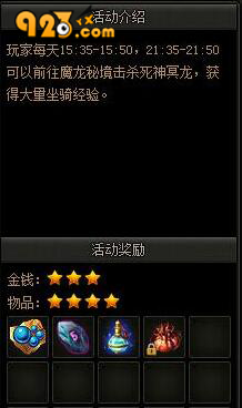 魔龍秘境不是全天開放的,只有在每天的15:35-15:50以及21:35-21:50才會開啟?;顒娱_啟后,大家即可找到活動NPC進入秘境。秘境中會刷新大量的精英和一個boss死神冥龍,殺精英有概率會掉落到坐騎進階丹,擊殺boss一定會掉落坐騎進階丹。