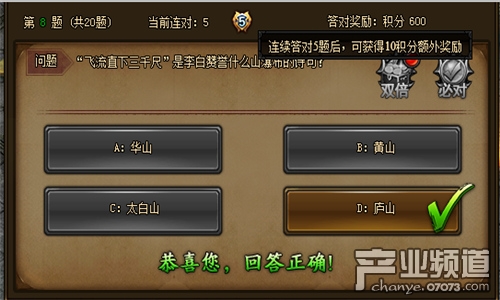 在答題過程中,可使用“雙倍”和“必對”功能,點擊“雙倍”按鈕,即可在答對該題目時獲得雙倍積分,點擊“必對”按鈕,無論提交的答案是否正確,都會判定為正確。6399yx《藍月傳奇》連續(xù)答對5、10、15題時,還將獲得額外的積分獎勵。