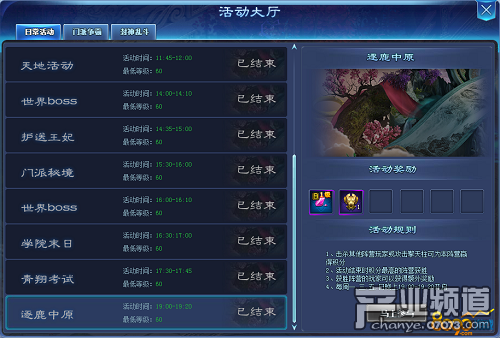 精彩根本停不下來,8090哪吒戰(zhàn)楊戩中的活動大廳為大家準(zhǔn)備了豐富精彩的眾多活動,包括日?;顒?、門派爭霸、封神亂斗等,其中日常活動中各時間點(diǎn)都有火爆活動上線,逐鹿中原便是每周一、三、五、日的19:30-20:00開放,凡是等級達(dá)到60級的玩家均可參與。
