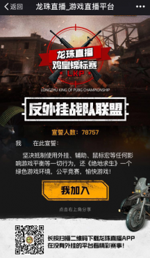 然后這幾天,龍珠直播的官方平臺又發(fā)布了一個反外掛戰(zhàn)隊聯(lián)盟,邀請參賽戰(zhàn)隊,平臺主播,吃雞玩家一起來宣誓反對外掛。
