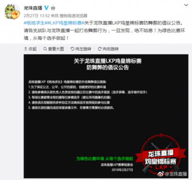 龍珠最近主辦的《絕地求生》比賽LKP雞皇錦標賽,已經(jīng)進入到循環(huán)賽的階段,這個比賽可以說是小編見過的反外掛,反作弊最為嚴厲的比賽。