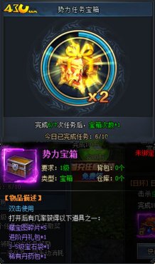 每完成2、4、7、10次任務可獲得1個任務寶箱,開啟任務寶箱就可獲得豐厚獎勵。如果玩家覺得已接受的任務太難的話還可以放選擇棄任務,而且當玩家退出了勢力后,當前進行的任務會做放棄處理!