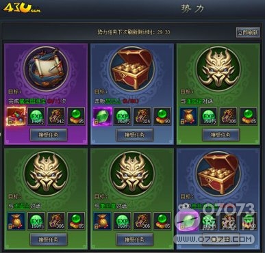 玩家每天最多可領(lǐng)取10次獎勵并領(lǐng)取10次任務獎勵,每隔30分鐘就會刷新一波任務,土豪也可手動消耗元寶來刷新哦!品質(zhì)越高的任務,獎勵越豐厚哦!