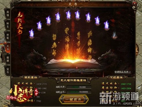 玩家可看到9377小志傳奇天書系統(tǒng)分為多個等階,而每個等階又分為多個星級。天書等階越高,帶來的屬性加成就更多。玩家消耗一定的書靈和一定的金幣即可提升游戲里的天書系統(tǒng)。