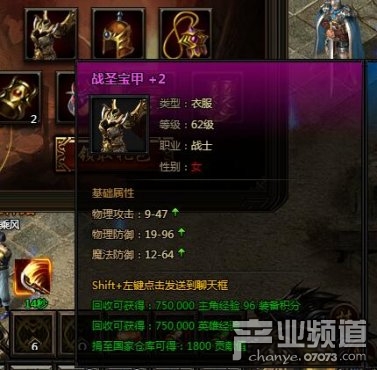戰(zhàn)圣寶甲+2。62級戰(zhàn)士衣服。提歐物理攻擊、物理防御以及魔法防御的略微增長。