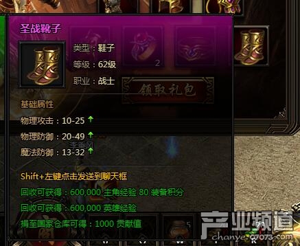 圣戰(zhàn)靴子。62級戰(zhàn)士鞋子。提歐物理攻擊、物理防御以及魔法防御的略微增長。