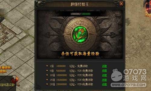 超級經(jīng)驗玉存滿之后也就只有1000000/1000000的狀態(tài),領取的時候可以有從1倍~20倍的5種選擇。如圖所示,剛才小編獲得的就是VIP1的領取方式,所以才能拿到500萬的經(jīng)驗值;如果你覺得不滿足,VIP2、VIP3、VIP4分別可以拿到10倍、15倍和20倍。聽上去是否過于嚇人呢?100萬的20倍等于2000萬的經(jīng)驗值。原來蘿卜玩《炎龍傳奇》游戲里傳聞的超級經(jīng)驗玉果然有奇效,如果你是VIP4,一顆2000萬的經(jīng)驗值就送你了!