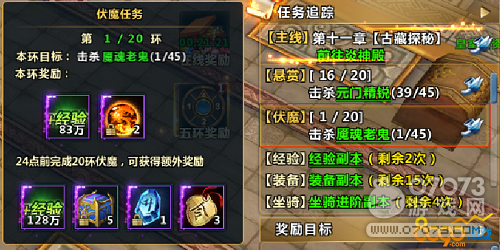 進(jìn)入8090武動(dòng)乾坤后,在游戲主界面的【任務(wù)追蹤】下面可以看到【伏魔】,伏魔任務(wù)為擊殺多個(gè)同種怪物,玩家點(diǎn)擊怪物名稱可以自動(dòng)尋路到刷怪點(diǎn),也可以飛機(jī)直達(dá)。通過附魔任務(wù)可以獲得海量的經(jīng)驗(yàn),每五環(huán)還可以抽一次獎(jiǎng)品。