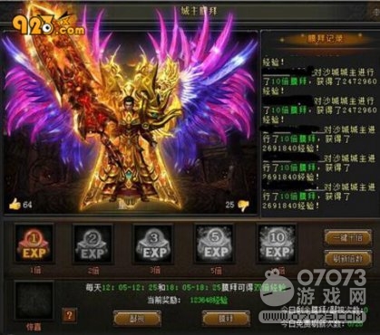 膜拜城主還可進(jìn)行刷新,每天均有免費(fèi)刷新次數(shù),用完后可通過消耗50綁定元寶進(jìn)行一次刷新,刷新有幾率提升膜拜獎(jiǎng)勵(lì)倍數(shù),最高可獲得10倍獎(jiǎng)勵(lì),也可花費(fèi)100元寶直接一鍵獲得10倍經(jīng)驗(yàn)效果。每次膜拜鄙視可獲得大量經(jīng)驗(yàn)獎(jiǎng)勵(lì),還有機(jī)會獲得禮包,一鍵十倍必出禮包。