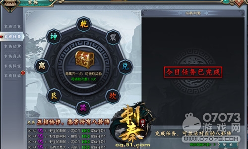 51《刺秦秘史》中,每個家族成員每天總共可完成9次家族任務,獲得大量經驗、家族貢獻獎勵。每個家族任務都配對一個卦象,玩家完成任務則可激活對應八卦卦象,當激活全部八個卦象時,所有家族成員將可領取一次寶箱獎勵。每次激活八卦并領取獎勵后,將重置八卦為未激活狀態(tài),可重新激活并獲取新的一輪獎勵。