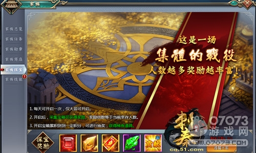 家族探寶每天可由家族開啟一次,進入活動地圖內可自由采集地圖內刷新的寶箱并獲得獎勵。采集寶箱中有一定幾率采到炸彈被炸死,請及時向其他家族成員進行呼救。地圖內存活的家族成員越多,采集寶箱獲得獎勵越高,家族所有成員累計采集達到一定數(shù)量后,還可獲得抽獎次數(shù),抽取諸多稀有獎勵。