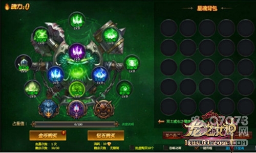 星盤共有四種,等級由低到高分別是綠色、藍(lán)色、紫色、紅色星空盤,星盤等級越高,能獲得高級顏色星魂的概率越大;當(dāng)玩家星宮命脈提升到1級1星以上,即會開啟"占星"界面。消耗一定綁定金幣,即可購買星魂石,獲得占星機(jī)會,隨機(jī)獲取各種不同屬性的星魂;每次購買星魂石會隨機(jī)增加占星值;占星值滿了之后會隨機(jī)激活一個(gè)高級星盤,在高級星盤里獲取高級顏色星魂的概率越大;對于多余或者顏色等級較低的星魂,可進(jìn)行選擇性吞噬,吞噬后可獲得該星魂的魂力;魂力可對當(dāng)前裝備星魂進(jìn)行升級;