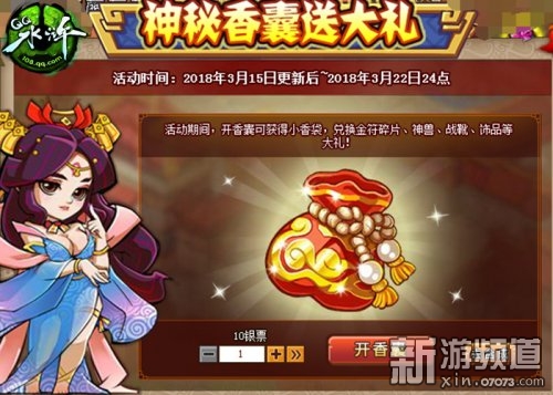 在3月15日至3月22日期間,《QQ水滸》開啟全新活動(dòng)“福星高照”,活動(dòng)期間隨機(jī)出現(xiàn)福星禮包,包含武將自選包、護(hù)甲穿透寶石、神獸、戰(zhàn)靴、飾品材料自選包等超值內(nèi)容,搶到就是賺到。同時(shí)游戲還上線“神秘香囊送大禮”活動(dòng),開香囊可獲得小香囊,兌換神裝、金符碎片、神獸,戰(zhàn)靴、飾品等珍貴道具,給你一個(gè)“中飽私囊”的機(jī)會(huì)。還有高回報(bào)、低風(fēng)險(xiǎn)“資源投資”活動(dòng)一齊開啟,給你更勁爆的福利回饋。
