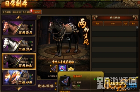 這就不得不提到一騎當(dāng)千副本了,此副本屬于多人副本,在開服第五天開啟。副本共分為六個難度,玩家進(jìn)入不同難度的副本需要有不同靈獸等階限制,且不同難度的副本共用每日次數(shù),且每日可挑戰(zhàn)1次。副本玩法是將游蕩的靈獸驅(qū)趕到指定NPC處后,完成副本第一階段,之后將刷出副本最終BOSS,擊殺BOSS后即可完成副本。副本獎勵大量靈獸裝備碎片、靈獸靈魂、靈獸資質(zhì)丹、金幣。靈獸裝備碎片可在中州-神爐處合成靈獸裝備。
