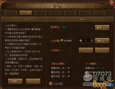 我們進(jìn)入公會(huì)以后,可以捐獻(xiàn)不是我們自己職業(yè)的裝備來獲得貢獻(xiàn)值,再用貢獻(xiàn)值兌換我們需要的裝備,而公會(huì)的榮譽(yù)即代表了我們的榮譽(yù),我們需要升級(jí)我們的公會(huì)等級(jí),這樣公會(huì)在公會(huì)列表里面的排名才會(huì)上升,而且升級(jí)公會(huì)可以給我們帶來屬性加成。想要升級(jí)公會(huì)的話只能通過捐獻(xiàn)金幣增加我們的公會(huì)財(cái)富,然后通過消耗工會(huì)財(cái)富來升級(jí)我們的公會(huì)。