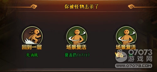 在古樓中,如果角色被守衛(wèi)擊殺了,玩家就會(huì)有三個(gè)選項(xiàng)可以選擇,選擇在當(dāng)前場景復(fù)活或是回到一層。玩家在角色被擊殺后返回一層不會(huì)消耗任何材料,如果選擇在當(dāng)前場景復(fù)活則需要消耗1瓶復(fù)活藥,如果玩家手中沒有復(fù)活藥,也可以使用10個(gè)元寶來復(fù)活,效果都是一樣的。