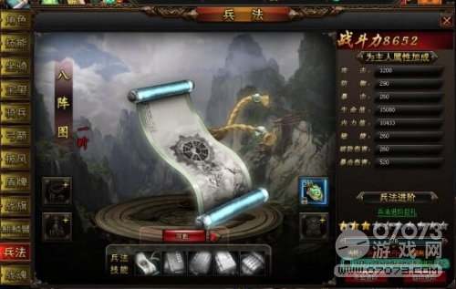 當玩家玩到一定等級,系統(tǒng)會自動為你開啟兵法。我們首先要看到的是八陣圖,傳說是由諸葛亮的岳父所創(chuàng),后來被諸葛孔明發(fā)揚光大。一旦開啟兵法系統(tǒng),無論品階高低,都會有四大鑲嵌位置可鑲嵌一定的配飾。右側(cè)我們可以看到戰(zhàn)斗力的提升,最終主人的屬性加成是通過八大屬性來決定的。傲天我是皇中兵法進階需要進階丹來完成,我們可以通過綁定元寶購買獲得進階丹,同樣也可以通過做任務副本來獲得。