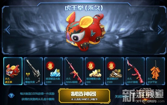 卓越級近戰(zhàn)武器“虎王拳”需要玩家在神器工廠新春禮盒中獲取哦。每次制造神器都需要消耗一定數(shù)量的神器碎片和神器精華,制造神器一次100%獲得一件獎(jiǎng)勵(lì),獲得過的獎(jiǎng)勵(lì)將從禮盒中刪除。碎片和精華可通過精彩活動(dòng)獲得。