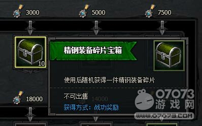 3000點戰(zhàn)功達成后。戰(zhàn)功獎勵可以獲得精鋼裝備碎片寶箱10個。使用后隨機獲得一件精鋼裝備碎片。不可出售。獲得方式:戰(zhàn)功獎勵。