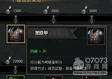1500點戰(zhàn)功達成后。戰(zhàn)功獎勵可以獲得黑鐵甲。防御+30。黑鐵甲同樣可以分解,分解為40裝備積分。獲得方式也是:戰(zhàn)功獎勵、裝備兌換商店。