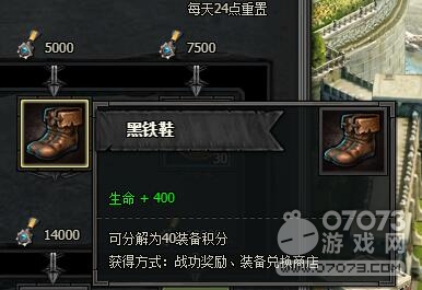 5000點戰(zhàn)功達成后。戰(zhàn)功獎勵可以獲得黑鐵鞋。生命+400??煞纸鉃?0裝備積分。獲得方式:戰(zhàn)功獎勵、裝備兌換商店。