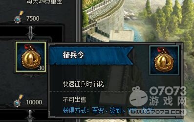 7500點戰(zhàn)功達成后。戰(zhàn)功獎勵可以獲得征兵令30個。作用是快速征兵時消耗。不可出售。獲得方式:軍資、簽到、VIP、戰(zhàn)力。