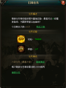 每位玩家第一次刷新日常任務(wù)等級(jí)都能百分百刷新出十級(jí)的日常任務(wù)。
