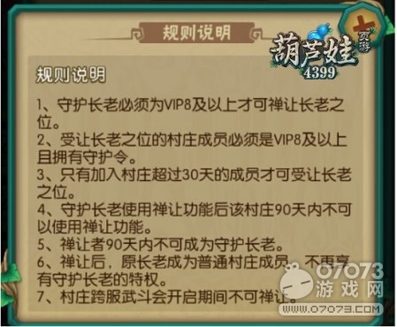 1、守護長老必須為VIP8及以上才可禪讓長老之位。