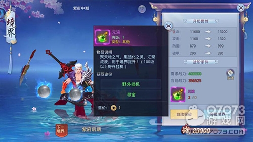境界蛻變不僅是實(shí)力的提升,也是榮耀的象征,其中“元液”是玩家突破境界最重要的一環(huán),當(dāng)?shù)烙褌冞_(dá)到相應(yīng)等級與戰(zhàn)力的同時(shí)還要擁有元液才可成功突破,并且境界越高,需要的元液也就越多。這里,道友們也不用特別擔(dān)心,小編偷偷告訴你,元液可以通過野外掛機(jī)與尋寶獲得哦~祝你們好運(yùn)!