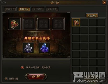 蘿卜玩《傳奇霸業(yè)》地圖上大大小小的boss數(shù)不勝數(shù),根據(jù)自己的戰(zhàn)力打到高級的boss就會有幾率掉落轉(zhuǎn)生裝備,如果是打到自己能夠穿戴的正好,如果是別的職業(yè)的或者是低轉(zhuǎn)生的裝備,我們就可以考慮分解了,畢竟留在背包里也占空間。打開鍛造系統(tǒng)-高級,我們可以看到裝備分解,點擊沒用的裝備就會出現(xiàn)在分解欄里,分解也是有幾率獲得黑鐵或者是星辰的,當(dāng)然星辰的幾率是比黑鐵低的。