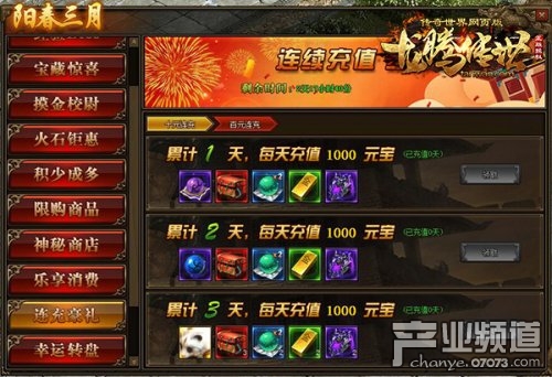 積少也能成多,活動(dòng)驚喜連連,每充值100元寶可獲得1積分,消耗指定物品和積分即可將1個(gè)物品變成3個(gè)。在貪玩?zhèn)髌媸澜纭洱堯v傳世》累計(jì)消費(fèi)滿足到了要求,還可以領(lǐng)取洪荒首飾、修羅之羽寶盒、傳世靈戒等相應(yīng)獎(jiǎng)勵(lì),花得越多賺的越多。連充更有豪禮送,每天充值10元、100元即可領(lǐng)取境界修為、特戒禮盒,連充三天,絕版坐騎送給你,更多特戒禮盒讓你不虛此行。