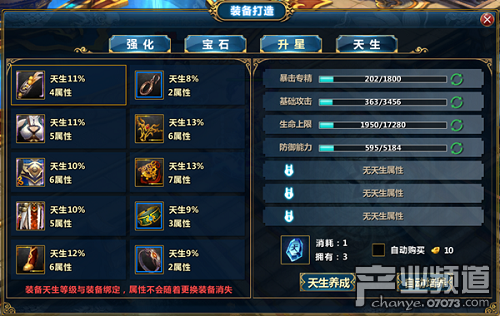 升星則是在選擇一件裝備后點(diǎn)擊開始升星按鈕,當(dāng)進(jìn)度條滿后星級(jí)則會(huì)提升。天生培養(yǎng)同樣如此,選擇一件裝備點(diǎn)擊天生培養(yǎng)按鈕,屬性就會(huì)得到提升,不過當(dāng)進(jìn)度條滿后則不能繼續(xù)提升。天生轉(zhuǎn)化需要玩家選擇一條屬性,點(diǎn)擊開始轉(zhuǎn)化按鈕,右邊會(huì)生成一條屬性。點(diǎn)擊替換屬性按鈕,屬性改變;點(diǎn)擊再來一次按鈕,將重新生成一條新屬性。也可使用道具天生鎖定符,一定時(shí)間內(nèi)新屬性百分比和原屬性百分比將保持一致。