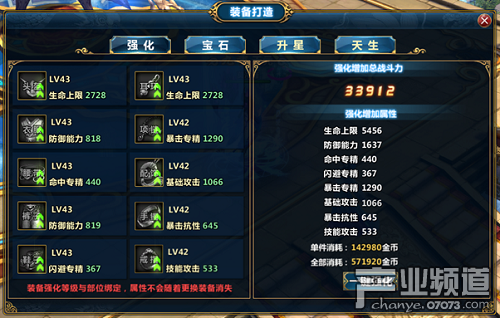 裝備打造包括強(qiáng)化、寶石鑲嵌、升星和天生操作,裝備強(qiáng)化等級(jí)可增加屬性值,向上綠色箭頭表示當(dāng)前可強(qiáng)化。玩家點(diǎn)擊一鍵強(qiáng)化按鈕可通過消耗金幣,增加屬性。此外選中寶石點(diǎn)擊開始精煉按鈕,在進(jìn)度條滿后,寶石即可升級(jí)。寶石還可進(jìn)行轉(zhuǎn)化,玩家選中寶石后再選擇想要轉(zhuǎn)化的寶石,點(diǎn)擊確定轉(zhuǎn)化,寶石屬性就會(huì)改變。
