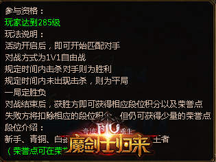 《奇跡重生:魔劍士歸來(lái)》跨服對(duì)戰(zhàn)玩法為各路頂尖玩家提供了一個(gè)展現(xiàn)自我的舞臺(tái)。如果你戰(zhàn)斗力不俗,如果你身懷強(qiáng)大的PK技術(shù),那么跨服對(duì)戰(zhàn)將給你一次盡情表現(xiàn)的機(jī)會(huì)。發(fā)揮你最強(qiáng)大的PK技術(shù),讓無(wú)數(shù)玩家戰(zhàn)敗在你的腳下吧!