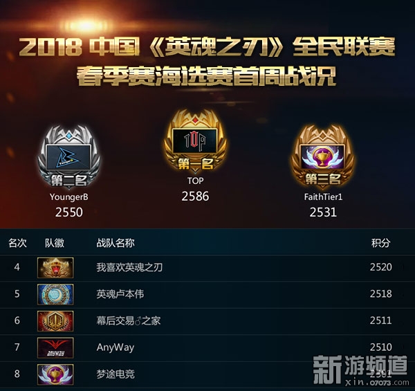 英雄匯聚,戰(zhàn)火驟然迸發(fā)!《英魂之刃》全民聯(lián)賽春季賽海選賽于3月16日已火熱開(kāi)戰(zhàn), 本次比賽戰(zhàn)況十分激烈,更有如TOP、Anyway等豪強(qiáng)戰(zhàn)隊(duì)的加盟。經(jīng)過(guò)一周激烈的角逐,目前以下八支戰(zhàn)隊(duì)暫且名列前八位。