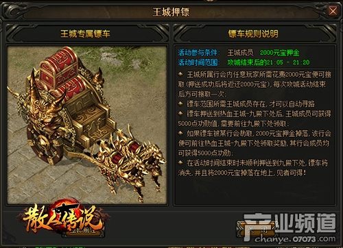 王城爭(zhēng)霸結(jié)束后,王城押鏢也是一件不亞于攻城的重頭戲。攻城結(jié)束后21:05-21:20,王城所屬行會(huì)可參與一次王城押鏢,行會(huì)任意一名成員以2000元寶作為押金(護(hù)送鏢車成功后退還),可接取皇家鏢車。當(dāng)皇家鏢車范圍內(nèi)有該行會(huì)成員存在時(shí),皇家鏢車才會(huì)自動(dòng)尋路,將皇家鏢車護(hù)送至熱血王城-九殿下處即押鏢成功。押鏢成功后,該行會(huì)的所有成員可在九殿下處領(lǐng)取5000點(diǎn)功勛值?;顒?dòng)時(shí)間結(jié)束時(shí),未順利將皇家鏢車護(hù)送至九殿下處,皇家鏢車消失,護(hù)送失敗,2000元寶押金掉落地上。若皇家鏢車中途被其他行會(huì)的成員劫取,2000元寶押金掉落地上,劫鏢成功的行會(huì)所有成員可在九殿下處領(lǐng)取5000點(diǎn)功勛值。