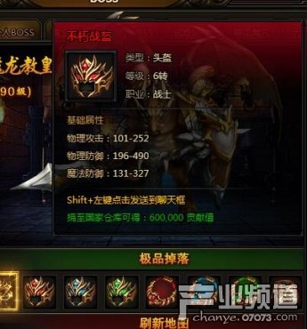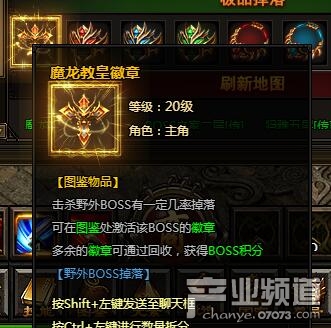 在掉落極品道具方面:魔龍教皇會掉落魔龍教皇徽章、不朽戰(zhàn)盔(6轉(zhuǎn))、不朽法盔(6轉(zhuǎn))、不朽道盔(6轉(zhuǎn))、不朽戰(zhàn)鏈(6轉(zhuǎn))、不朽法鏈(6轉(zhuǎn))、不朽道鏈(6轉(zhuǎn))、不朽戰(zhàn)帶(6轉(zhuǎn))以及不朽法帶(6轉(zhuǎn))。