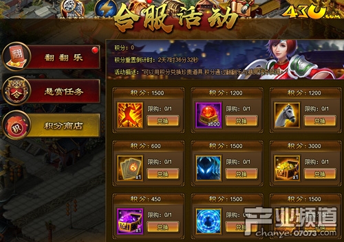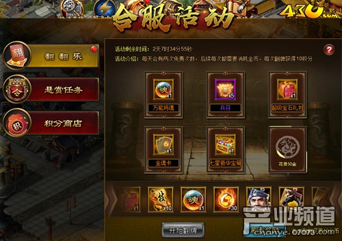 43u《極品三國志》合服活動(dòng)分為翻翻樂、懸賞任務(wù)、積分商店,玩家每天會(huì)有兩次的免費(fèi)次數(shù),后續(xù)每次都需要消耗金幣,每次翻牌將獲得10積分,玩家可根據(jù)牌面的展示獎(jiǎng)勵(lì)是否滿意來進(jìn)行刷新獎(jiǎng)勵(lì)操作。