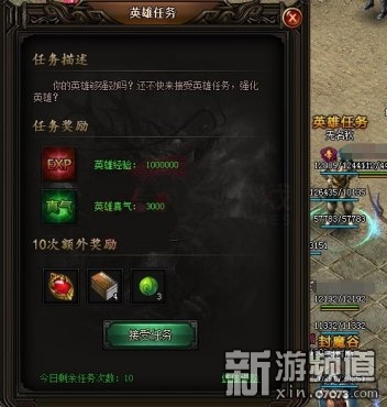 進(jìn)入8090刺沙后,英雄便是陪你出生入死的好兄弟,若想要強(qiáng)化英雄,那么就來(lái)接取英雄任務(wù)吧,也就是游戲中的日常任務(wù),玩家每天可以接取任務(wù)十次。玩家每完成一次英雄任務(wù),即可獲得英雄經(jīng)驗(yàn)100w以及英雄真氣3k,而完成十次英雄任務(wù)將額外獎(jiǎng)勵(lì)普通經(jīng)驗(yàn)玉、職業(yè)技能書(shū)包以及低級(jí)真氣丹。