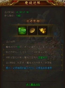 魔域迷陣活動可在開放時間內(nèi)通過土城的魔域迷陣使者進入。傳送門選擇錯誤的話會被傳送到上一層或出發(fā)地點,可通過路線記錄工具記錄正確的傳送到下一層的傳送門位置。到達第十層可與第十層的迷陣守衛(wèi)對話,領取獎勵并進入魔域密室擊殺最終BOSS,進入魔域密室后,擊殺BOSS獲得豐厚裝備獎勵。