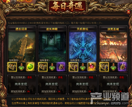 在全服擊殺900級以上的BOSS有幾率發(fā)現(xiàn)遺忘沼澤、迷失神殿、天機祭壇和洪荒圣城秘境挑戰(zhàn)入口,每天每個秘境只可以發(fā)現(xiàn)一次哦!難怪叫每日奇遇,玩家們趕快來奇遇你的秘境吧!聽說世界BOSS身上有幾率掉落不同級別得奇遇幸運丹,使用后可以大幅度提升秘境的附加發(fā)現(xiàn)幾率哦!