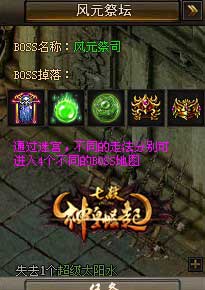 四大BOSS地圖分別是:暗元祭壇、水元祭壇、風元祭壇和火元祭壇。擊殺BOSS有機會獲得末日裝備,初級魂力丹以及萬妖幡碎片,后兩者都是法器提升的必備材料哦!