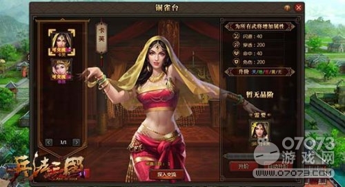 五位美女的親密度各不相同,當(dāng)親密度升滿后,美人會進(jìn)入銅雀臺,給玩家附加永久屬性加成。在銅雀臺中玩家可以與美人進(jìn)行深入交流,深入交流可以使美人心情愉悅,帶來更高的屬性加成,讓領(lǐng)主們的稱霸之路更加暢通無比!