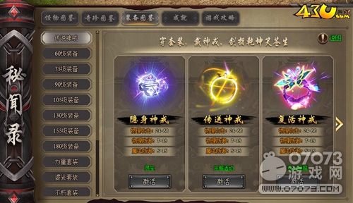 43u《魔魂之刃》分為殺怪贊圖鑒,提升各項(xiàng)屬性的怪物圖鑒、騎神獸戴神翼,獲得超炫外形的奇珍圖鑒、穿套裝戴神戒,劍指乾坤笑蒼生的裝備圖鑒、江湖之上,流傳傳說的成就、錦囊妙計手中握,如虎添翼乾坤破的游戲攻略。