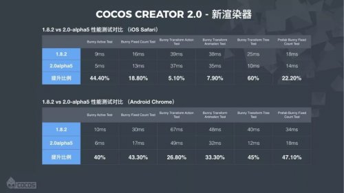 在周六的會(huì)上,我也展示了 Cocos Creator 2.0 的性能飆升,我們只是用了在 3D 研發(fā)上得到的部分成果,一個(gè) 2D/3D 通用的渲染器,把 Cocos 原來的底層換掉,然后就得到了這樣的性能提高。Creator 2.0 目前已經(jīng)出到 Alpha-5 版本了,而且這次拉了騰訊互娛的大神們進(jìn)來趟坑。填完坑之后,應(yīng)該在 4~5 月份,就可以發(fā)至少 beta 甚至 RC 版給大家用了。