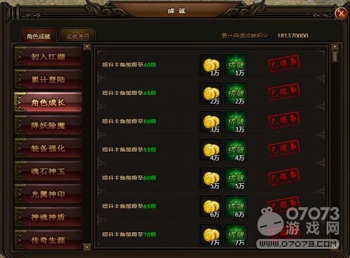 提升主角等級(jí)至70級(jí)??色@金幣7萬,成就積分7萬。